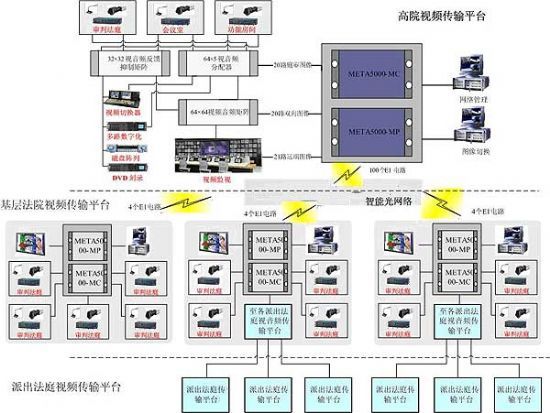 人民法院對審判信息具有嚴格要求,要求不間斷傳輸全市庭審圖像。為保證視頻傳輸系統穩定安全運行,從主會場機房到各分會機房采用4*2M傳輸專線, 到達各個分節點的傳輸速率均為8Mbps。北京法院視頻傳輸系統采用VTEL美國視訊公司具有高穩定、高清晰、多通道、可管理的新一代綜合視頻交換平臺——Meta 5000高清晰多通道視頻傳輸平臺。