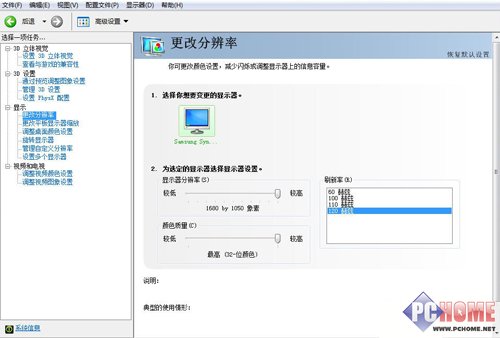 在控制面板程序中,界面左側的上半部分是常見的圖形選項,如分辨率、3D圖形設置等相關信息。而在下半部分的選項則是和3D顯示器有關。在控制面板中,可以手動開啟和關閉3D顯示的功能,并且能夠隨意調節3D畫面的景深(景深在3D眼鏡接收器上也可以調節)。