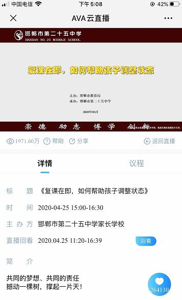 4月末,復課在即,如何幫助孩子盡快調整學習狀態,適應校園學習生活,成為了邯鄲市學校、家長共同關注的話題。基于邯鄲25中4月11日線上直播的成功經驗,邯鄲市教育局義務教育處依托邯鄲25中云直播平臺,組織開展了一場“家長學校”直播講座活動。這次視頻直播實現了24萬家長共上一節課,點擊量超1900萬次。