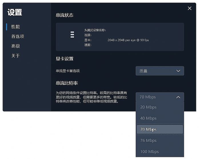 實測在比特率越高畫面越清晰,正常的情況下70 Mbps已經能夠保證足夠的畫質輸出,100Mbps已經接近顯卡直連的PC頭顯畫質。