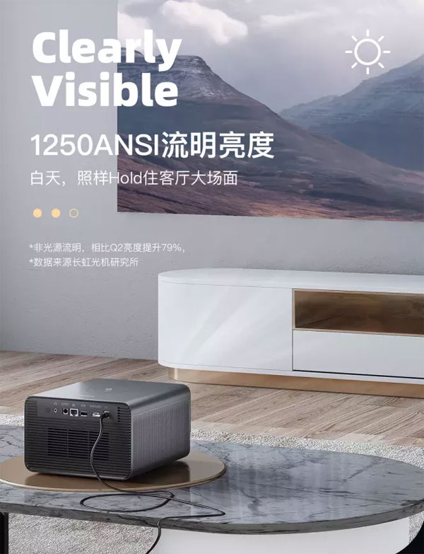 長虹智能投影儀Q3采用擁有11層納米級高光鍍膜的藍(lán)寶石AI智慧鏡頭,有效提升光通率和畫面解析度,整機(jī)亮度達(dá)到適合人眼舒適度的1250ANSI流明;白天的畫面清晰可辨,晚上的畫面亮麗不刺眼。
