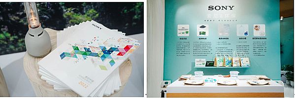索尼中國可持續發展報告2022》(左);環境創新材料及環保袋DIY區域(右)