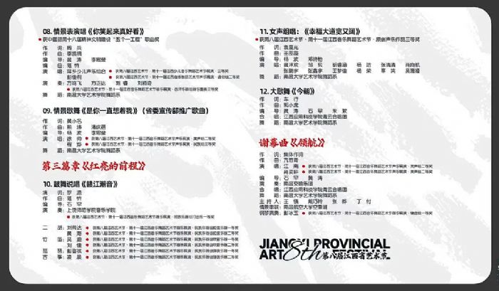 展演以“致敬!新時代”為主題,以“紅色的土地”“紅火的時代”“紅亮的前程”組成三大主體篇章,以“大棱角、多鏡面”的現代舞美設計理念,打造場景化、戲劇感、沉浸式的舞臺效果,呈現節奏明快、進程流暢、渾然一體的視聽效果。展演綜合運用戲劇、音樂、舞蹈、說唱等豐富的藝術手段,匯集第八屆江西藝術節獲獎作品精粹,集中展示了新時代江西文藝繼往開來、薪火相傳的精神風貌,為觀眾奉上了一場文化盛宴。