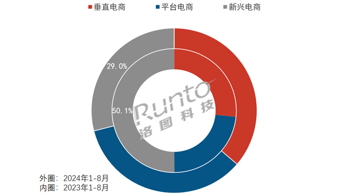 洛圖科技(RUNTO)大致將天貓、淘寶歸類于平臺電商,京東、蘇寧易購等歸類于垂直電商,拼多多、抖音、快手等歸類于新興電商。