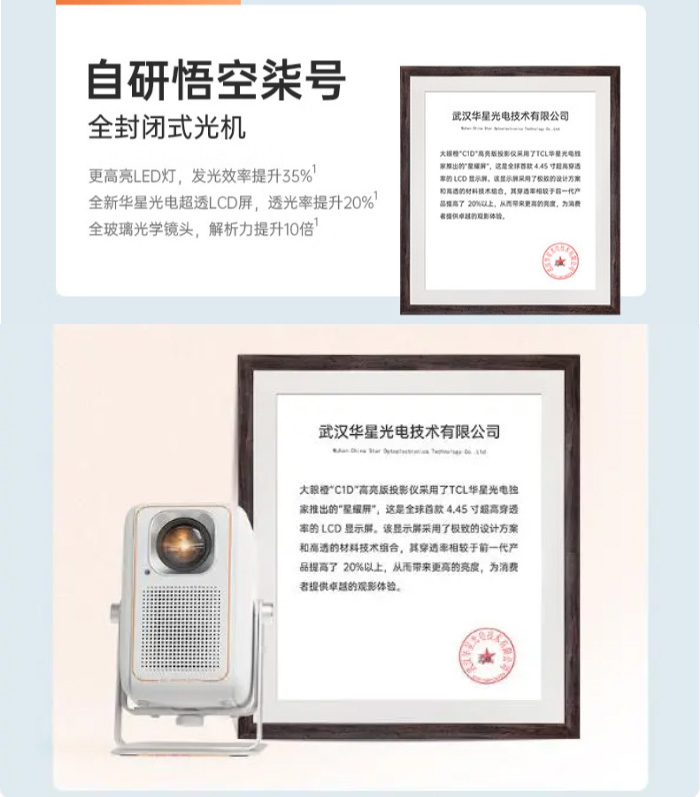 目前市場上采用華星光電液晶屏的智能投影機有大眼橙C1D等,該產品采用華星光電4.45寸 LCD 屏,自研新一代全封閉式光機、高亮LED燈、亮度達 700CVIA/lm²,擁有原生 1080P 分辨率,對比度 2800:1。