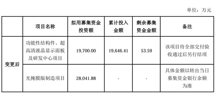 其中,“功能性結構件、超高清液晶顯示面板及研發中心項目”擬用募集資金投資額為19,700.00萬元,“光掩膜版制造項目”擬用募集資金投資額為28,041.88萬元。