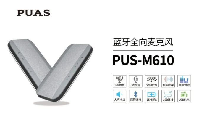 PUS-M610是普奧視自助設計生產(chǎn)的企業(yè)級全向藍牙麥克風,內(nèi)置6個陣列麥克風和45mm大功率全頻揚聲器,拾音半徑可達6米,60㎡以內(nèi)空間皆可使用。