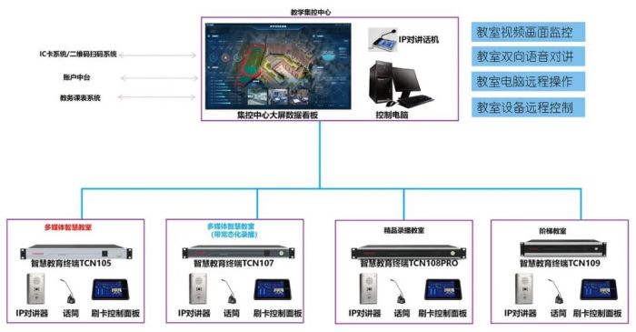 智慧教育整體解決方案,教室端以智慧教育終端為核心,集控平臺為上層應用,打造智慧教學場景下智能化巡課、集控管理,廣泛應用于高教、職業院校和K12等各類學校。