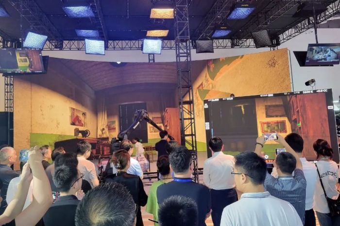 作為全球領先的智能視訊解決方案提供商,奧拓電子是虛擬拍攝領域的先行者,在全球范圍內已成功打造了近70個大中型虛擬影棚項目。此次電影周上,奧拓電子的VP虛擬拍攝解決方案尤為引人注目。該方案采用大面積的RM系列LED屏幕,提供卓越的顯示效果,完美替代傳統的綠幕和藍幕。通過實時渲染引擎和攝像機追蹤系統,虛擬場景能夠根據拍攝需求隨時調整,達到“所見即所得”的拍攝效果。這一技術不僅顯著提升了影片的制作質量,還大幅降低了成本,縮短了拍攝周期。