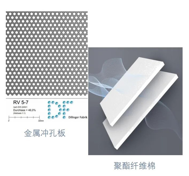 金屬平板吸聲體內(nèi)部填充的吸聲材料為進(jìn)口材料所制作的無(wú)甲醛聚酯纖維棉。聚酯纖維通過(guò)將聲能轉(zhuǎn)化為熱能并利用熱傳導(dǎo)效應(yīng),達(dá)到良好的吸聲效果。另外,聚酯纖維棉的纖維長(zhǎng)度比一般離心玻璃棉更長(zhǎng),不僅吸聲效果更好,也無(wú)甲醛釋放,環(huán)保親膚。