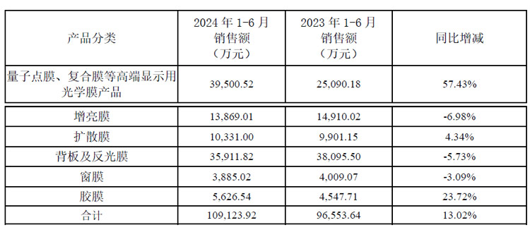 激智科技光學(xué)膜產(chǎn)品結(jié)構(gòu)繼續(xù)優(yōu)化,銷售收入同比增加,產(chǎn)能利用率提升,光伏板塊成功開(kāi)發(fā)高附加值新品并量產(chǎn),因此凈利潤(rùn)同比增加。報(bào)告期內(nèi),各產(chǎn)品銷售數(shù)據(jù)如下: