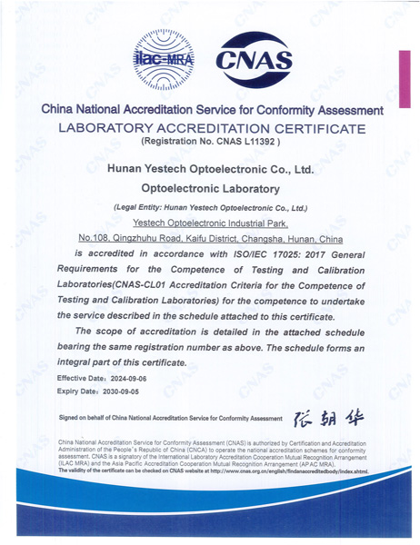 新亞勝光電實驗室于2018年9月正式通過中國合格評定國家認可委員會(CNAS)的評審考核,成為國家認可的實驗室(注冊號:CNASL11392)。