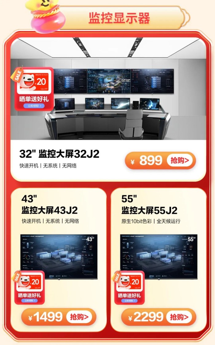 年貨節狂歡進行時,J2系列監控顯示屏性價比拉滿!其中,32J2監控顯示屏到手價899元,不足千元即可帶回家!43J2監控顯示屏到手價1499元,55J2監控顯示屏到手價2299元,曬單均贈京東E卡,購物超值加倍!如此優惠,錯過再等一年,趕緊下單吧!