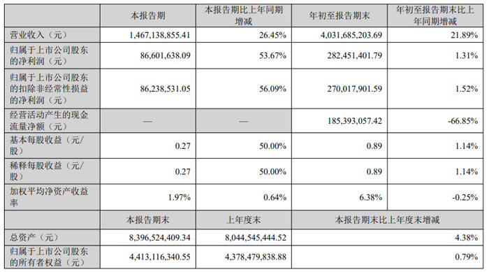 2025 年第三季度,公司實現營業收入 14.67 億元,較上年同期增長 26.45%,營收規模進一步擴大;歸母凈利潤 8660.16 萬元,同比大幅增長 53.67%,盈利增速顯著高于營收增速;扣非凈利潤 8623.85 萬元,同比增長 56.09%,扣除政府補助、理財收益等非經常性因素后,主營業務盈利能力進一步增強,反映出公司核心業務的市場競爭力持續提升。