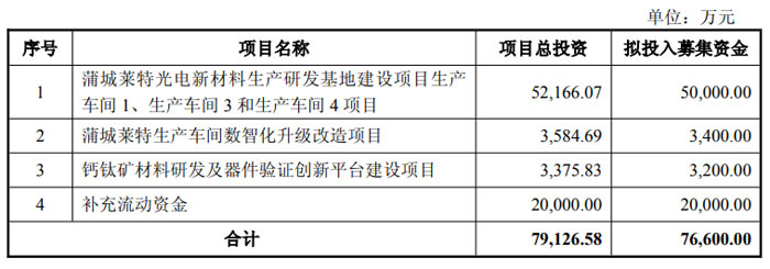 本次募集資金扣除發行費用后,將精準投向四大領域:其中 5 億元用于蒲城萊特光電新材料生產研發基地相關生產車間建設,3400 萬元用于蒲城萊特生產車間數智化升級改造,3200 萬元投入鈣鈦礦材料研發及器件驗證創新平臺建設,其余 2 億元用于補充流動資金。