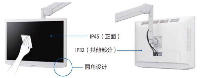 監(jiān)視器的窄邊框和圓角設(shè)計(jì)有助于在手術(shù)室中實(shí)現(xiàn)簡(jiǎn)單集成。LMD-32M1MD的正面防塵防水等級(jí)為IP45,整個(gè)監(jiān)視器的防護(hù)等級(jí)為IP32。