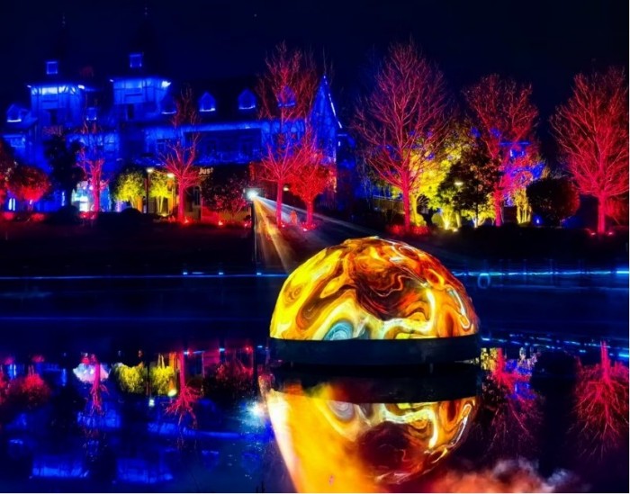 此次光影演出覆蓋五大核心場景,包括“玫瑰之約”教堂立面投影、“仙影闌珊”仿真花裙投影、“鐘樓幻境”、“法街·薔薇城堡”、以及直徑達四米的球幕投影“依欄問月”。這些創意應用將傳統文化與現代科技巧妙融合,為觀眾打造出獨特的視覺敘事體驗。