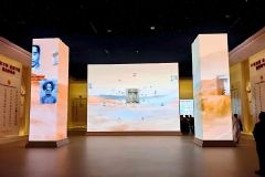 在整場宮宴中,多聲道環繞音響與動態光影配合, 在鐘鼓樂舞中將游客卷入千年前的御宴長夜。席間,唯有舞臺邊廊柱倏然亮起的一行行字幕,輕輕叩醒食客,原來不過是一隙古夢。得益于360度安裝方式,理光LW300ST短焦投影機能夠靈活地應對宴會現場復雜環境,把一行行字跡清晰地映在廊柱上,避免了字幕在表演過程中被遮擋,實現字幕與現場表演的涇渭分明。