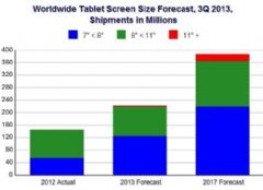 市場研究機構IDC的最新報告預測, 2013年全球平板設備出貨量將達到2.213億臺,略遜于稍早預估的2.274億臺,但仍比 2012年成長53.5%;而該機構也估計,平板設備市場成長速度將逐年趨緩,2014年成長率將來到22.2%,到2017年則將只有個位數(shù)字,屆時出貨量達到3.863億臺的高峰,略遜于先前預估的4.07億臺。…詳情>>
